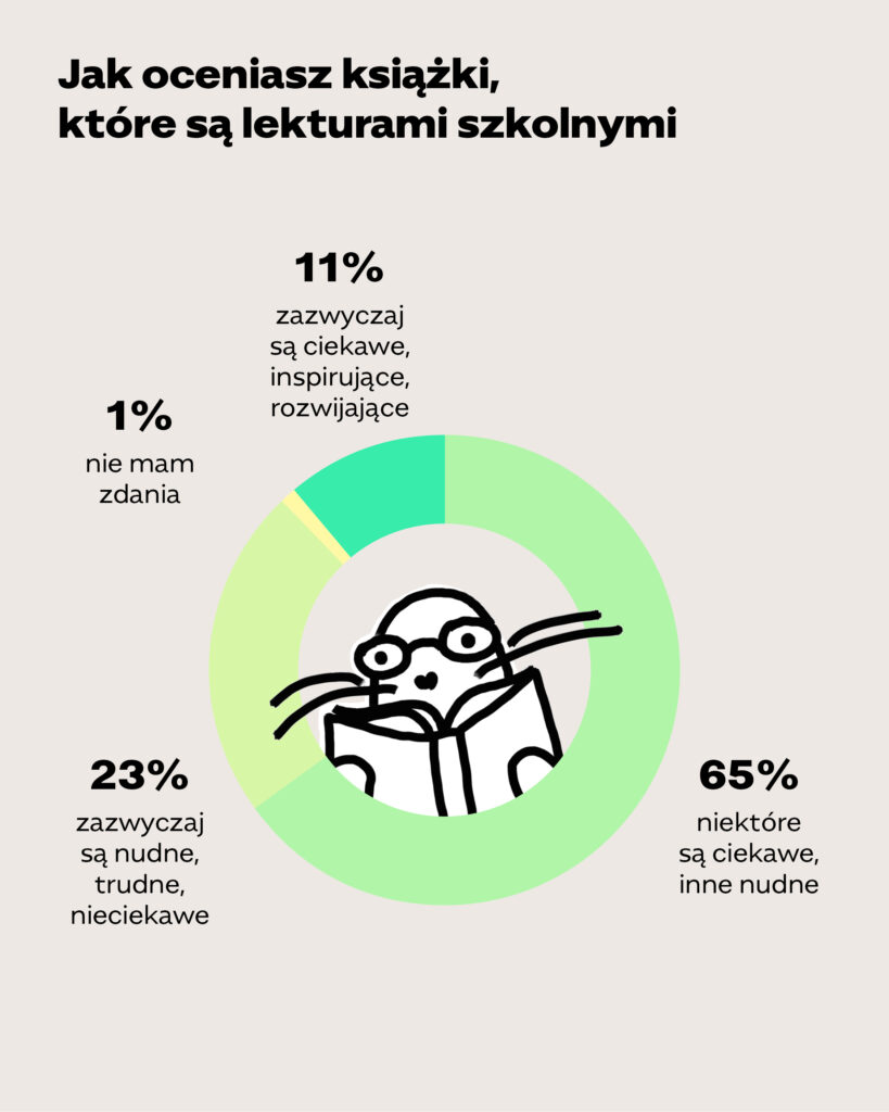 Na pytanie, jak ankietowani oceniają lektury szkolne, tylko 11% badanych, czyli nieco ponad co dziesiąte dziecko (w tym dwa razy częściej dziewczęta niż chłopcy – odpowiednio: 15% i 7%), ocenia, że zazwyczaj lektury szkolne są ciekawe, inspirujące, rozwijające. Przytłaczająca większość badanych, czyli 65%, (częściej chłopcy niż dziewczęta – odpowiednio: 70% i 60%) uważa, że niektóre lektury szkolne są ciekawe, inne nudne. Aż 23% ankietowanych, czyli co czwarty nastolatek (wyraźnie częściej jest to opinia starszych niż młodszych badanych – odpowiednio 29% i 18%), twierdzi, że lektury szkolne zazwyczaj są nudne, trudne, nieciekawe.