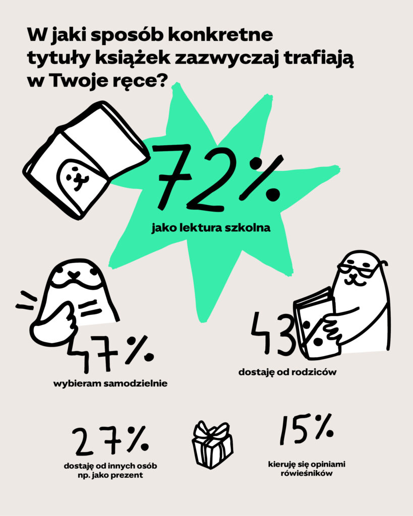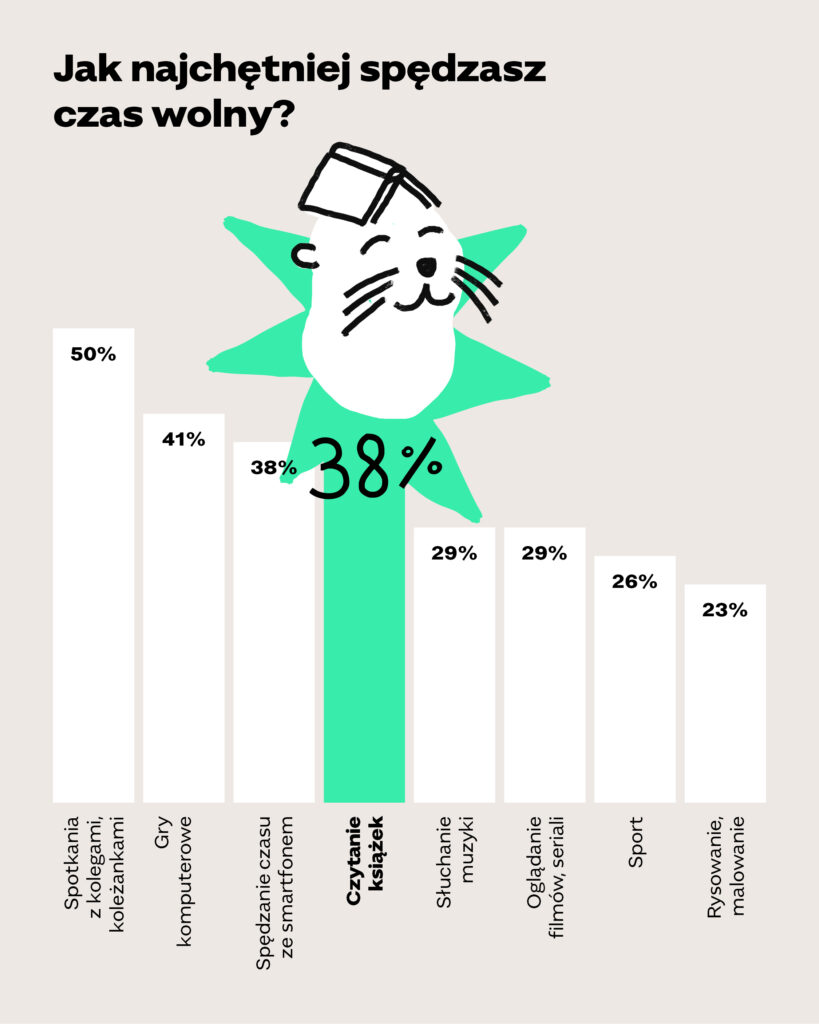 Ponieważ książki i czytanie nie istnieją w próżni, zapytaliśmy także młodych o to, jak najchętniej spędzają swój wolny czas. Wyniki raczej nie zaskakują – nastolatkowie i nastolatki najczęściej spędzają czas wolny z rówieśnikami (50% odpowiedzi) lub przy komputerze (41%). Czytanie znalazło się dokładnie na trzecim miejscu, ex aequo z czasem spędzanym na telefonie czy smartfonie.