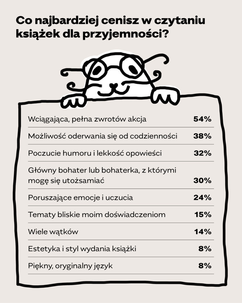 Naszym badanym zadaliśmy też dwa bardzo ważne pytania, dlaczego w ogóle sięgają po książki i co cenią w czytaniu dla przyjemności. Tutaj należy dodać, że czytanie dla przyjemności to wyższa szkoła literackiej podróży. Skupia się bowiem wyłącznie na pozytywnym doświadczeniu czytelniczym i dotyczy świadomego uczestnictwa w lekturze. Z naszych badań widać wyraźnie, że dla wielu młodych osób książki wciąż kojarzą się przede wszystkim z obowiązkiem – z lekturą szkolną czy zadaniem do wykonania. Jeśli jednak ktoś już połknie czytelniczego bakcyla i odkryje, że czytanie to coś bardzo własnego, okazuje się, że przyjemność płynąca z lektury ma wiele barw i odcieni. Młodzi najbardziej kochają historie, które wciągają bez reszty, pozwalają na chwilę oderwać się od codzienności, bawią lekkością i humorem. Wskazują też, jak ważna jest postać głównego bohatera lub bohaterki, z którymi można się utożsamić.