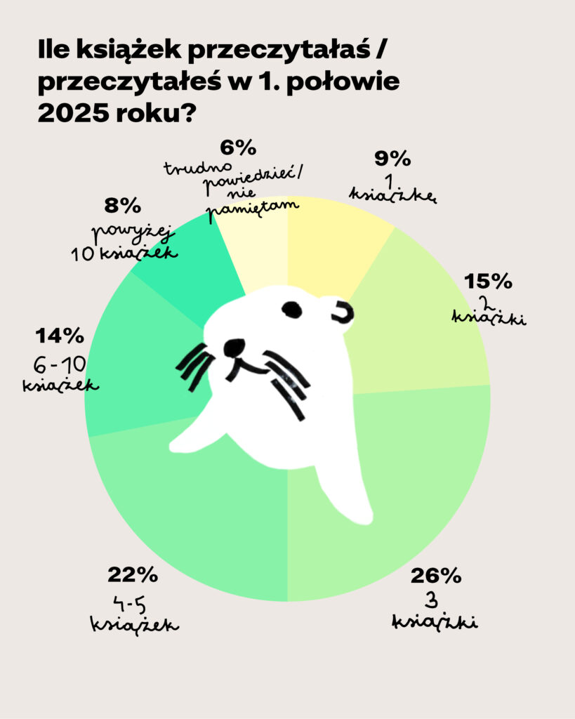 Pytanie o to, ile książek faktycznie przeczytali młodzi ludzie, zawsze budzi najwięcej emocji. Z naszych badań wynika, że w pierwszej połowie 2025 roku 50%  ankietowanych osób przeczytała nie więcej niż trzy książki. Co piąte dziecko przeczytało od 4 do 5 książek, tyle samo przeczytało więcej niż 5 książek. Średnia arytmetyczna w tym badaniu wyniosła 5 i jest wyższa u dziewcząt niż u chłopców (5,2 u dziewczyn i 4,8 u chłopców; mediana wyniosła tu: 4,5 u dziewczyn i 3 wśród chłopców) oraz wśród starszych dzieci niż młodszych (5,2 względem 4,9; tutaj mediana wyniosła 3).